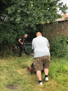 The Portacabins were made available for the Shed to occupy and work began on sorting out donated tools and checking that larger equipment was fit for use. The Portacabin nearest the Village Hall will be the workshop whilst the smaller one has become the refreshment zone. The outside space adjacent to the Portacabins is a great space to work outdoors and to relax in the open air.